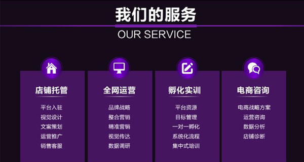 广告投放:资源利益最大化的广告投放计划与效果跟踪反馈,协助企业进行淘宝直通车等营销工具推广使用。 客户管理:客户关系管理团队与回访机制。